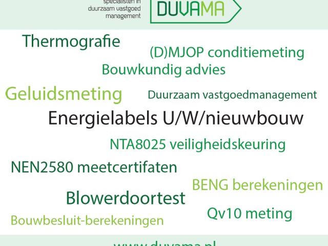 Duvama is een energieadviesbureau gevestigd in Apeldoorn. Wij zijn gespecialiseerd in meerjarenonderhoud en energetisch beheer (energielabel) van vastgoed. Huisvesting is belangrijk en wij kunnen u helpen om uw vastgoed betaalbaar in topconditie te houden. Of u nu gebruiker, Veeniging van eigenaars of belegger bent, het maakt niet uit. Vastgoed moet duurzaam, comfortabel en vooral betaalbaar zijn en blijven.