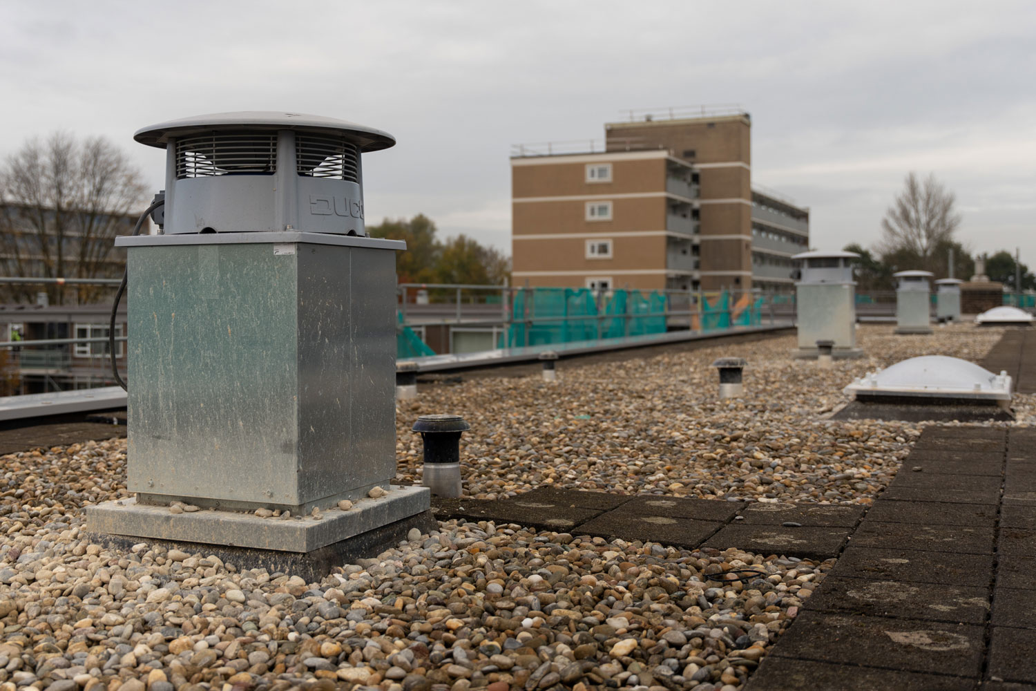 De oude dakventilatoren werden allemaal vervangen door de Duco RoofFan. Deze ondersteunen de werking van de eerder vernoemde individuele ventilatiesystemen. De DucoBox Reno blaast de vervuilde lucht uit in de schacht, waarna de Duco RoofFan die verder omhoog trekt. Op deze manier voorkomen we ongewenste stankoverdracht tussen de woningen en optimaliseren we de ventilatieprestaties.