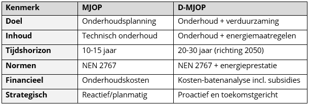 Een D-MJOP gaat verder dan een klassiek MJOP. Het combineert onderhoudsmaatregelen met verduurzamingsmaatregelen, afgestemd op de klimaatdoelen van 2050. Denk aan: