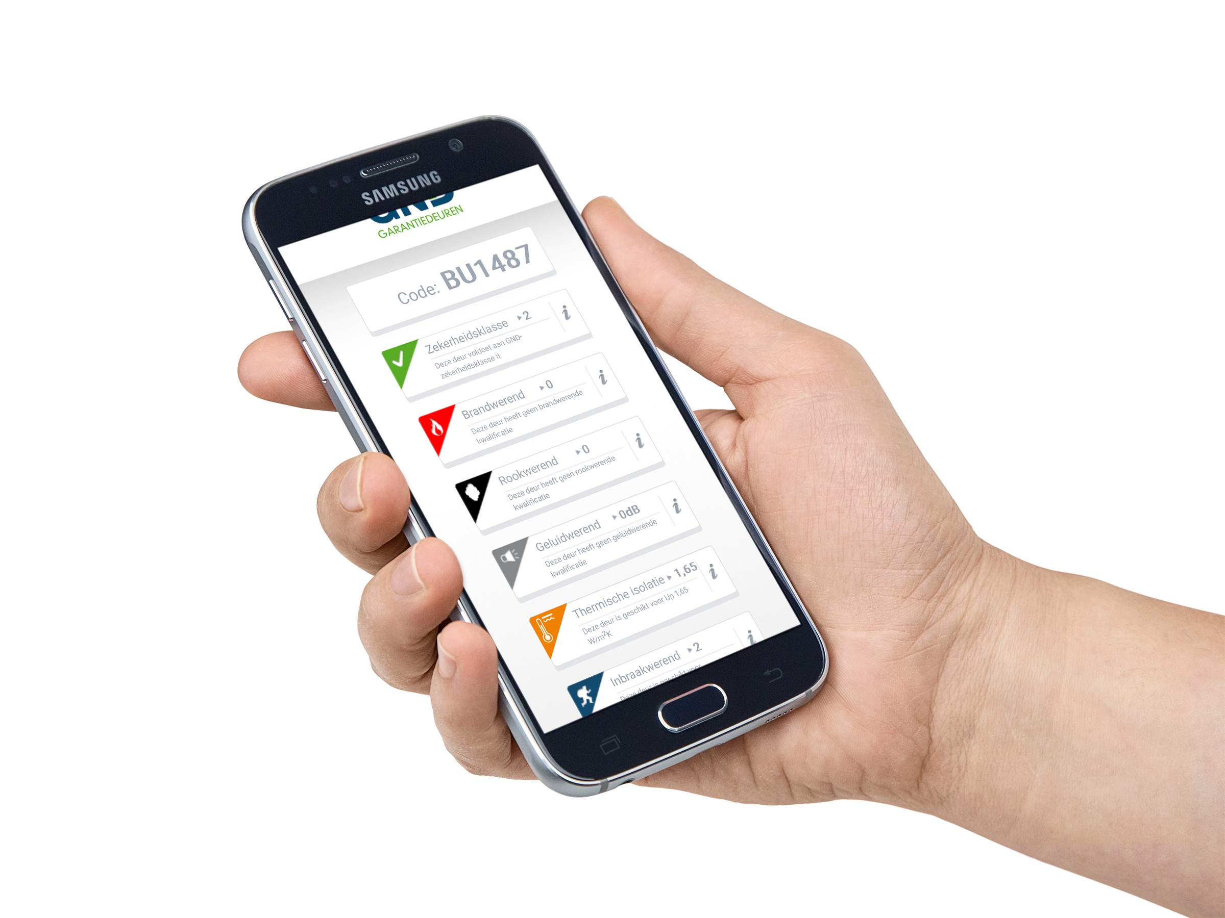 Het GND-zekerheidslabel is te vinden aan de scharnierzijde van de deur. Door de QR-code op het label te scannen kan eenvoudig de isolatieklasse van de deur worden afgelezen. Daarnaast zijn ook alle prestaties op gebied van brand-, rook-, geluid- en inbraakwerendheid te zien.
